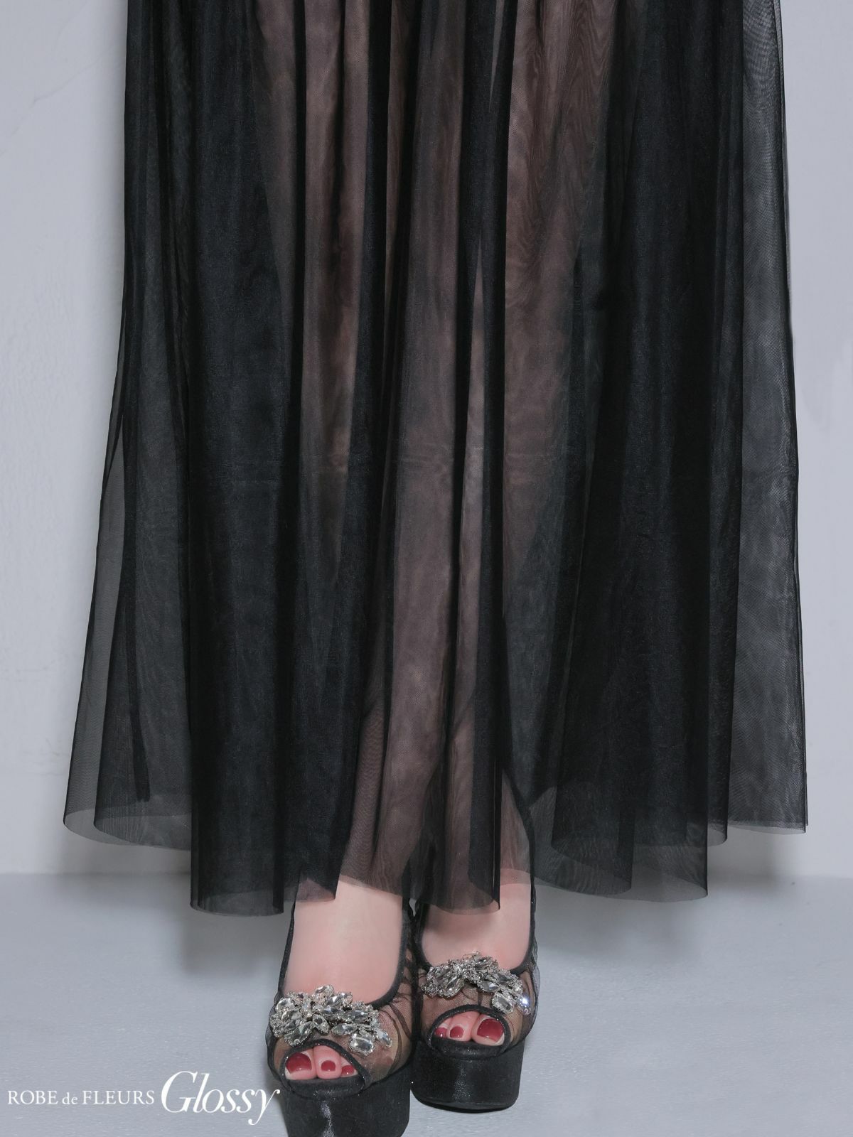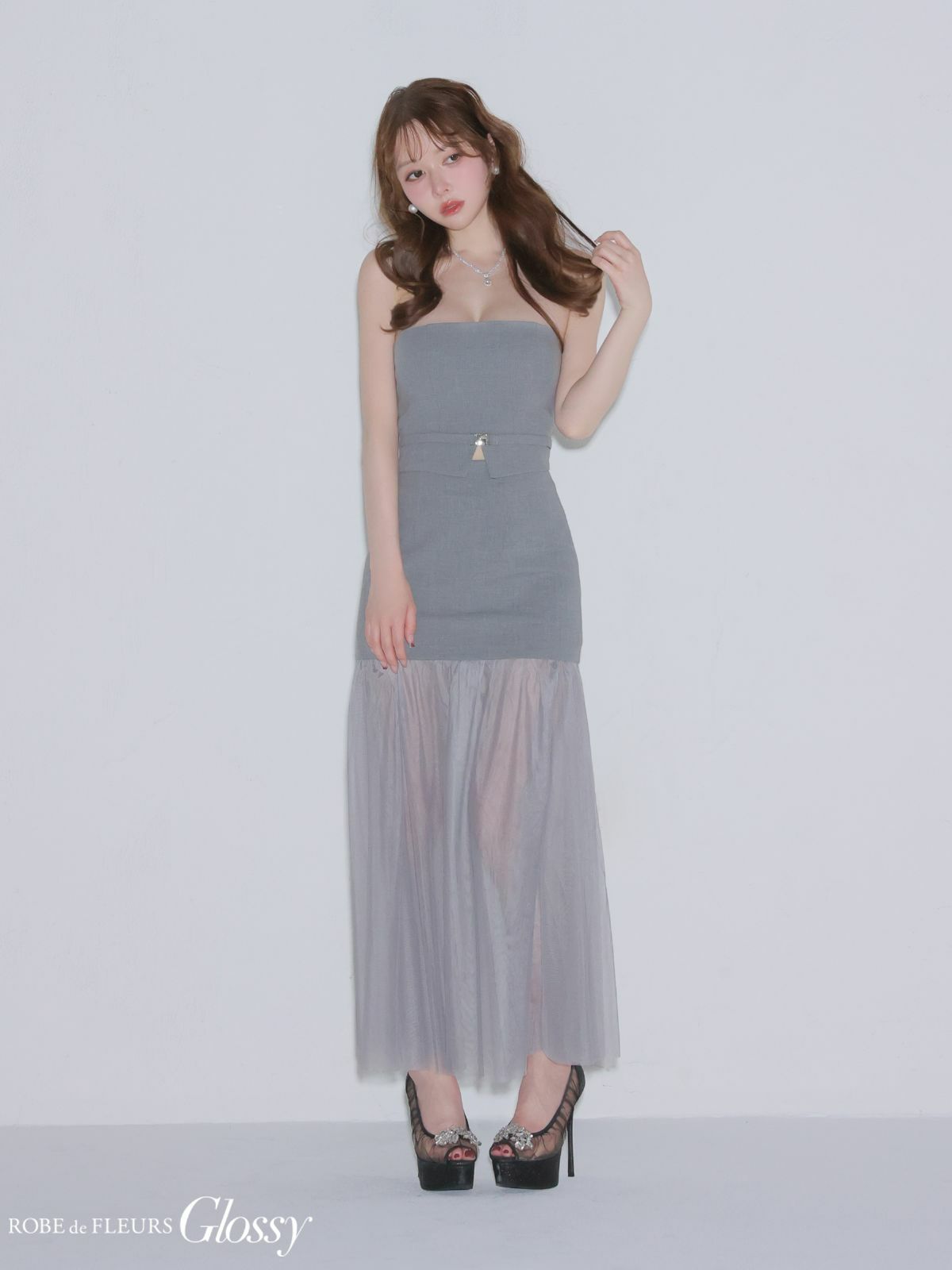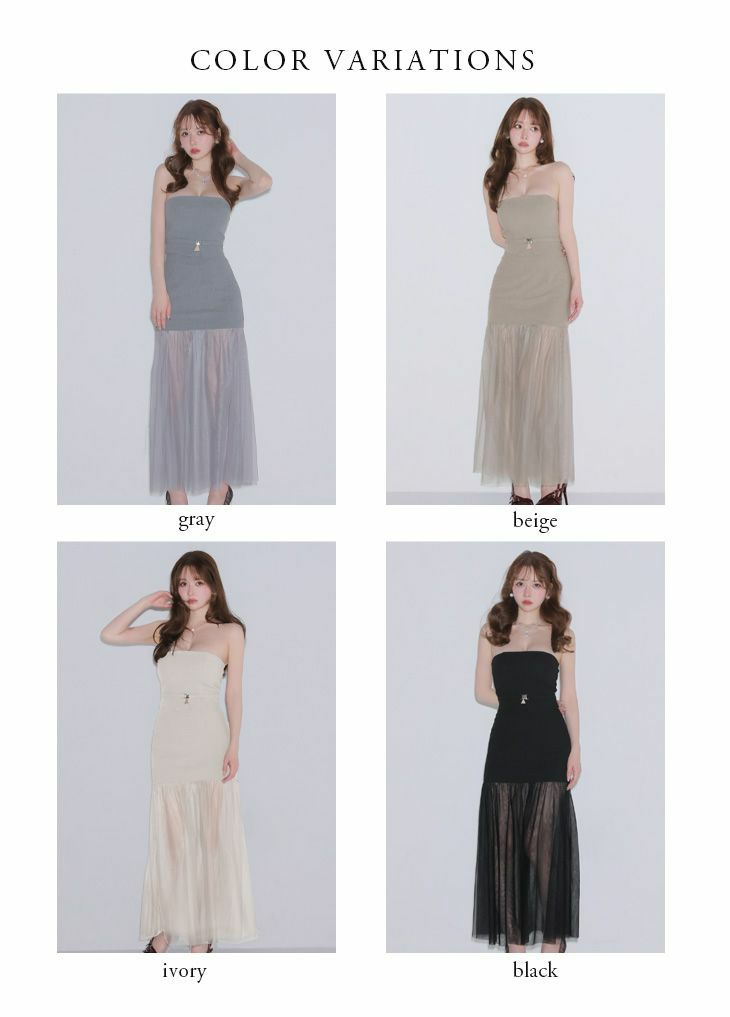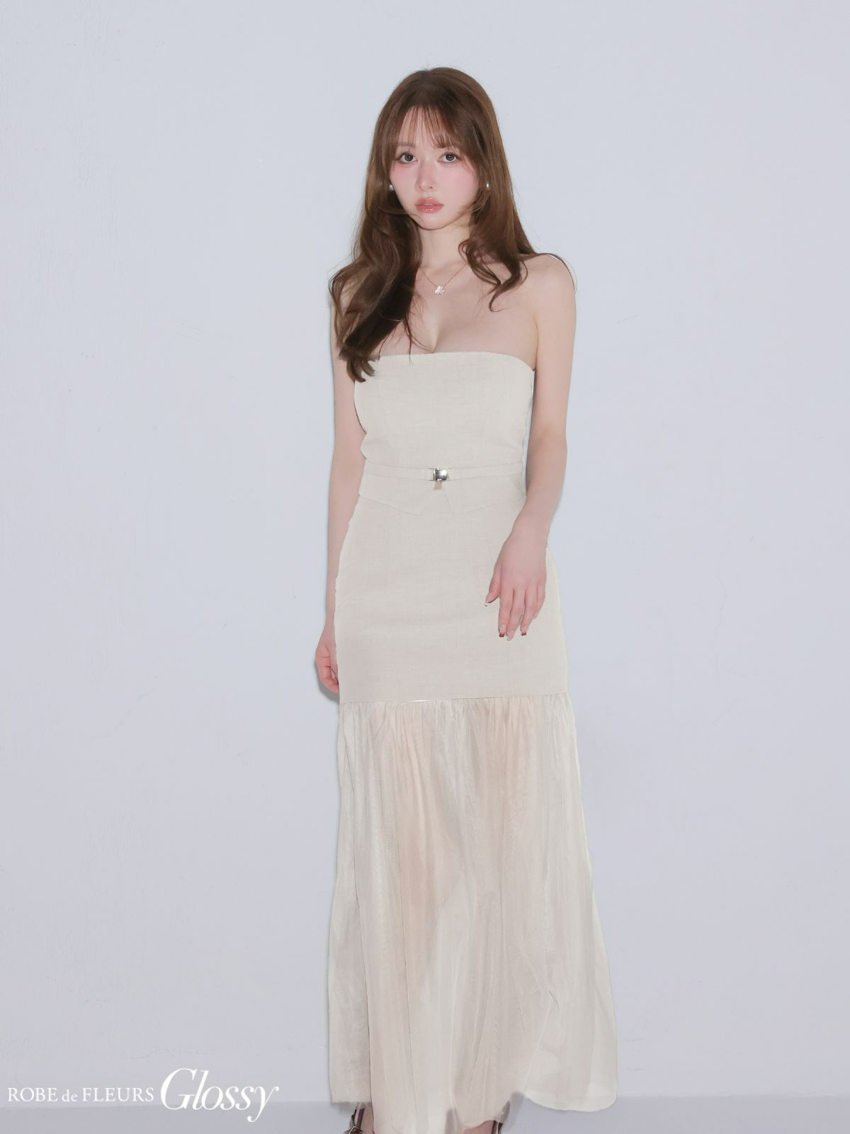 5. [ROBEdeFLEURSGlossy/ローブドフルールグロッシー] 高級 ブランド Aラインロングドレス 谷間 ベア セットアップ チュール切替 ウエストベルト ワンカラー
