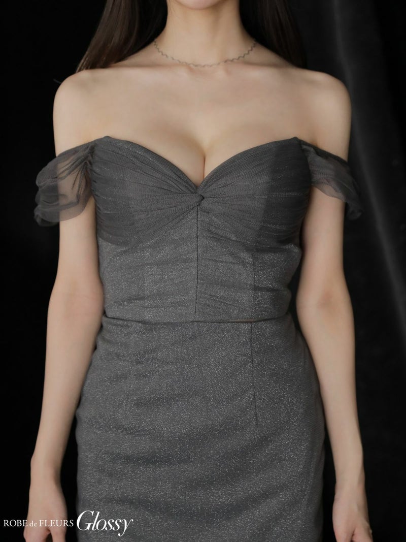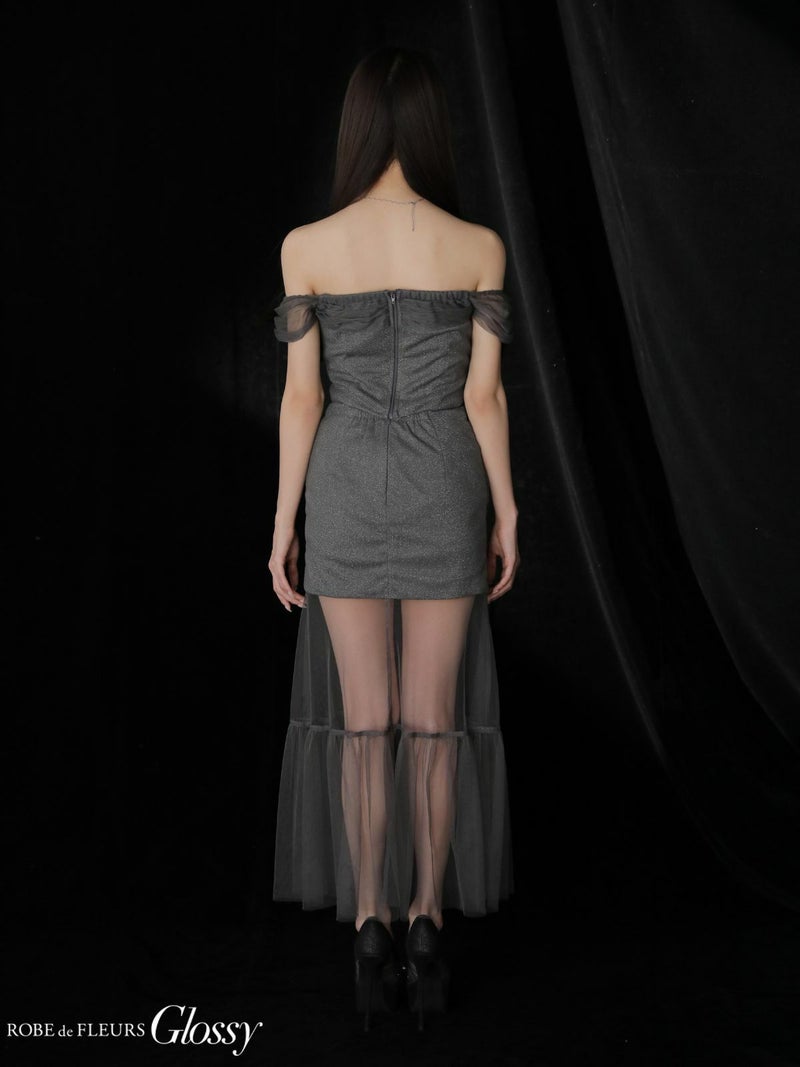 5. [ROBEdeFLEURSGlossy/ローブドフルールグロッシー] 高級 ブランド Aラインロングドレス 谷間 オフショルダー セットアップ チュール切替 ラメニット