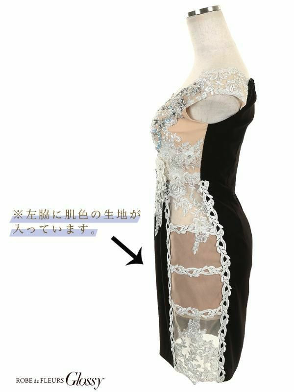 4. [ROBEdeFLEURSGlossy/ローブドフルールグロッシー] 高級立体フラワースパンコール刺繍サイドヌーディーレース切替ノースリーブタイトミニドレス