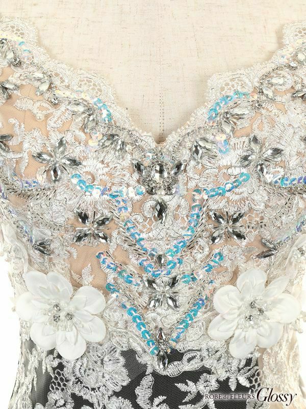 華やかな刺繍レースとビジューが煌びやか☆ [ROBEdeFLEURSGlossy/ローブドフルールグロッシー] 高級立体フラワースパンコール刺繍サイドヌーディーレース切替ノースリーブタイトミニドレス