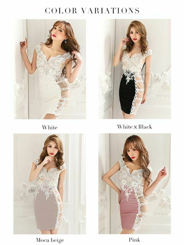 5. [ROBEdeFLEURSGlossy/ローブドフルールグロッシー] 高級立体フラワースパンコール刺繍サイドヌーディーレース切替ノースリーブタイトミニドレス