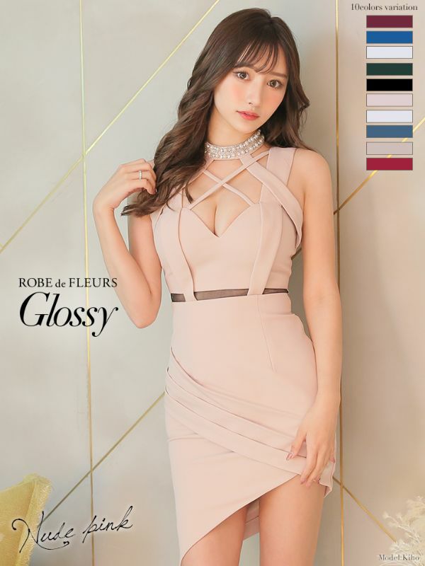 ROBEdeFLEURSGlossy ローブドフルールグロッシー 高級バストクロスノースリーブタイトミニドレス