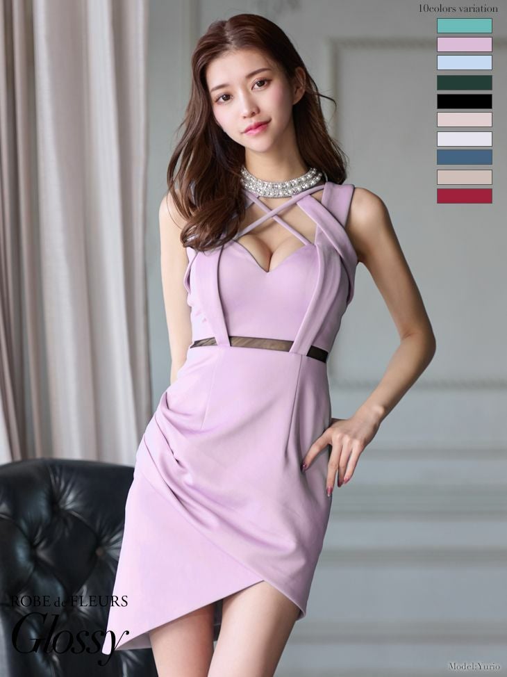 大胆なチュールの切替がセクシー☆ [ROBEdeFLEURSGlossy/ローブドフルールグロッシー] 高級バストクロスノースリーブタイトミニドレス