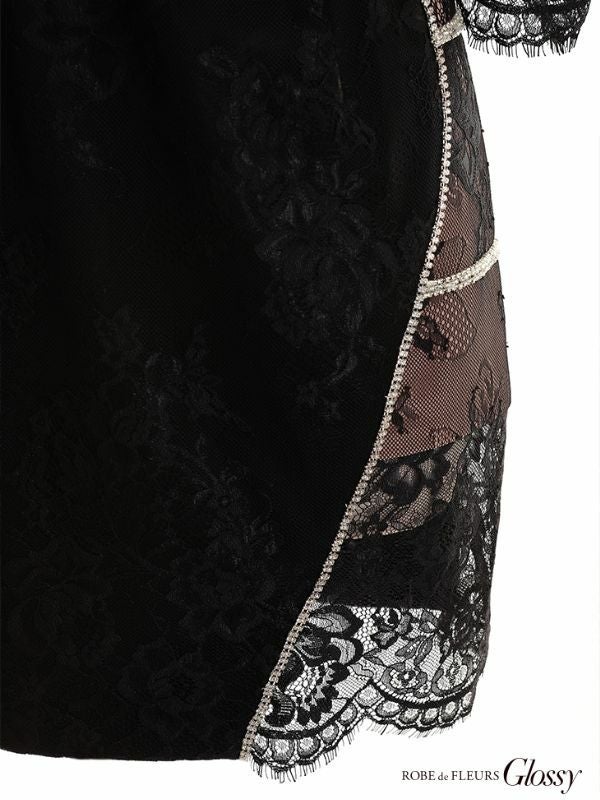 ROBEdeFLEURSGlossy ローブドフルールグロッシー 高級ジッパーデザインレース袖ありタイトミニドレス