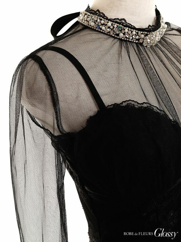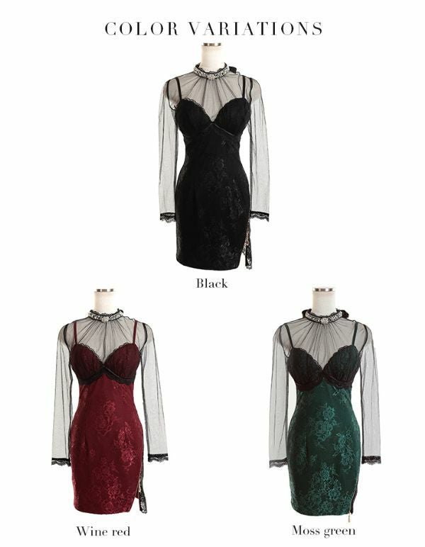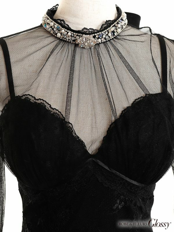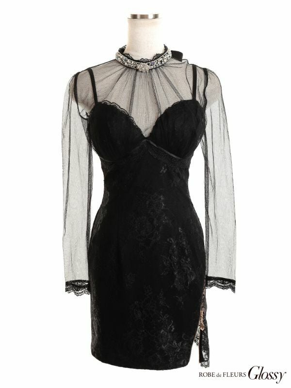 SEXYなビジュー×レースが目を惹く☆ [ROBEdeFLEURSGlossy/ローブドフルールグロッシー] 高級チュール長袖 袖ありハイネックシースルーデザインタイトミニドレス