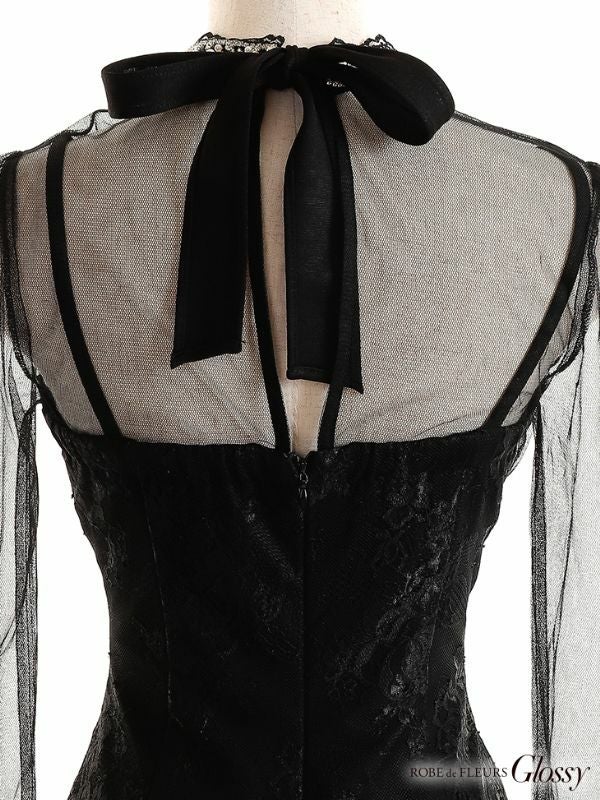 5. [ROBEdeFLEURSGlossy/ローブドフルールグロッシー] 高級チュール長袖 袖ありハイネックシースルーデザインタイトミニドレス