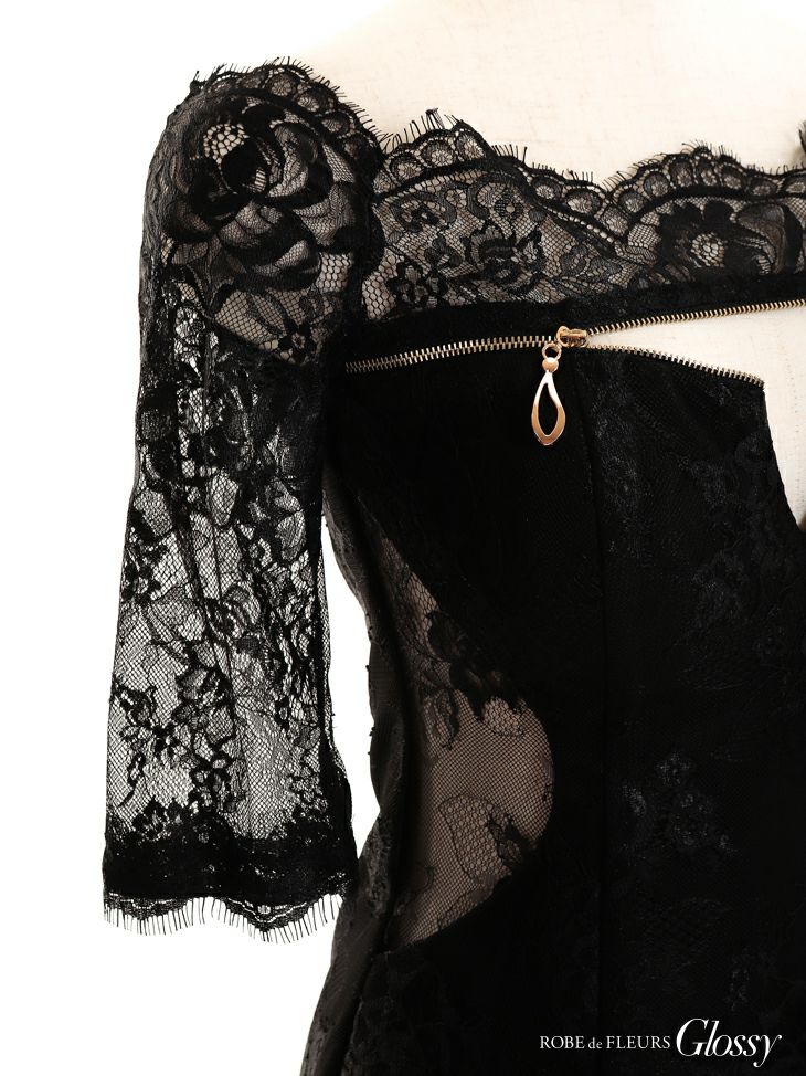 デコルテシップデザインが印象的☆ [ROBEdeFLEURSGlossy/ローブドフルールグロッシー] 高級オフショルフロントジッパー袖ありタイトミニドレス