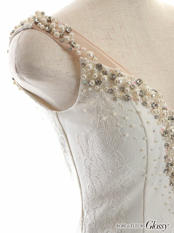 ROBEdeFLEURSGlossy ローブドフルールグロッシー 高級ノースリーブパールビジュー付きバストチュール切替総レースタイトミニドレス