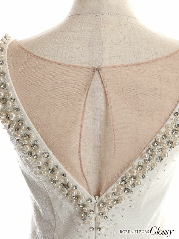 4. [ROBEdeFLEURSGlossy/ローブドフルールグロッシー] 高級ノースリーブパールビジュー付きバストチュール切替総レースタイトミニドレス