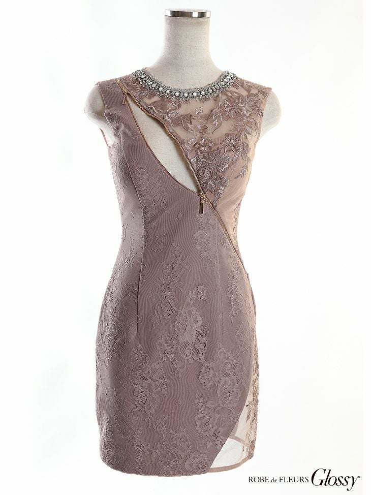 ROBEdeFLEURSGlossy ローブドフルールグロッシー 高級フロントジッパー×シースルーレースノースリーブタイトミニドレス