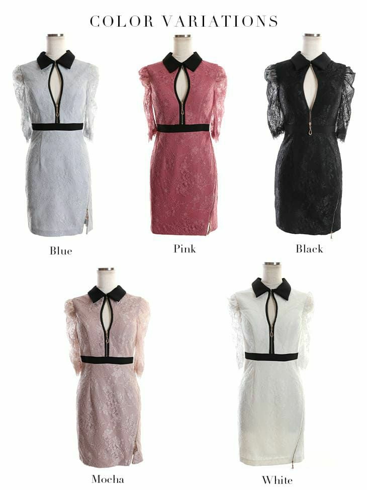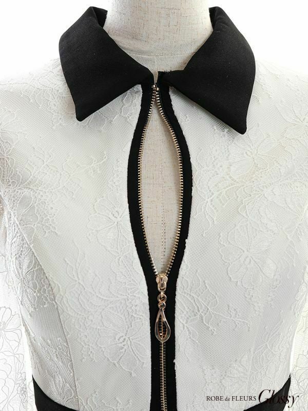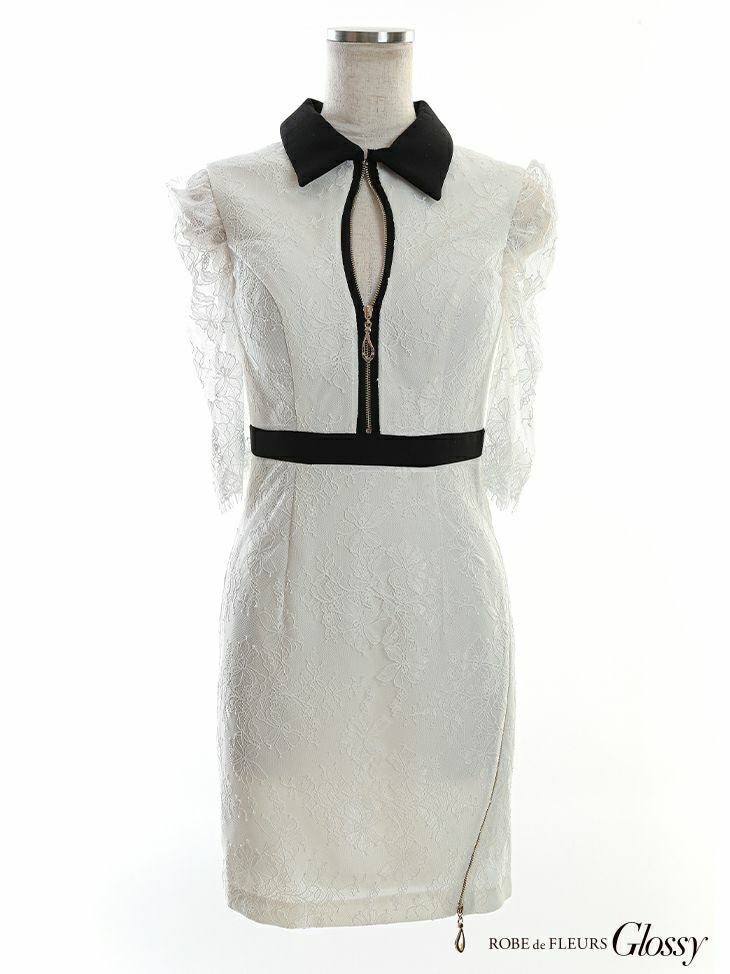 4. [ROBEdeFLEURSGlossy/ローブドフルールグロッシー] 高級 フロントジップ レース襟付き 袖あり タイトミニドレス