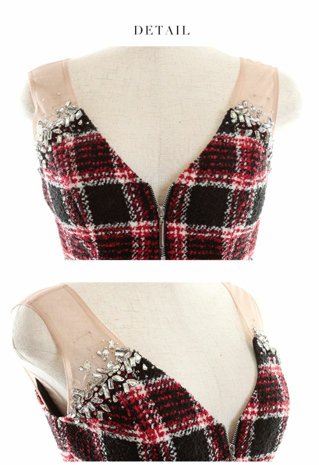大胆なバストカットが目を惹く☆ SALE [ROBEdeFLEURSGlossy/ローブドフルールグロッシー] 高級チェック柄ノースリーブチュールビジューフロントジップツイードタイトミニドレス