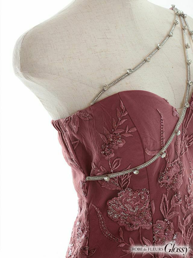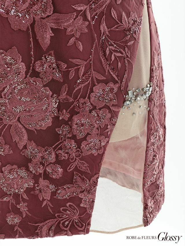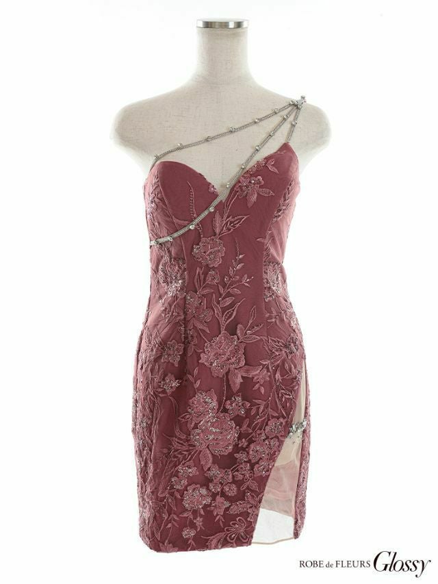 5. [ROBEdeFLEURSGlossy/ローブドフルールグロッシー] 高級フラワー刺繍レースビジューラインサイドチュールアシンメトリーワンショルダータイトミニドレス