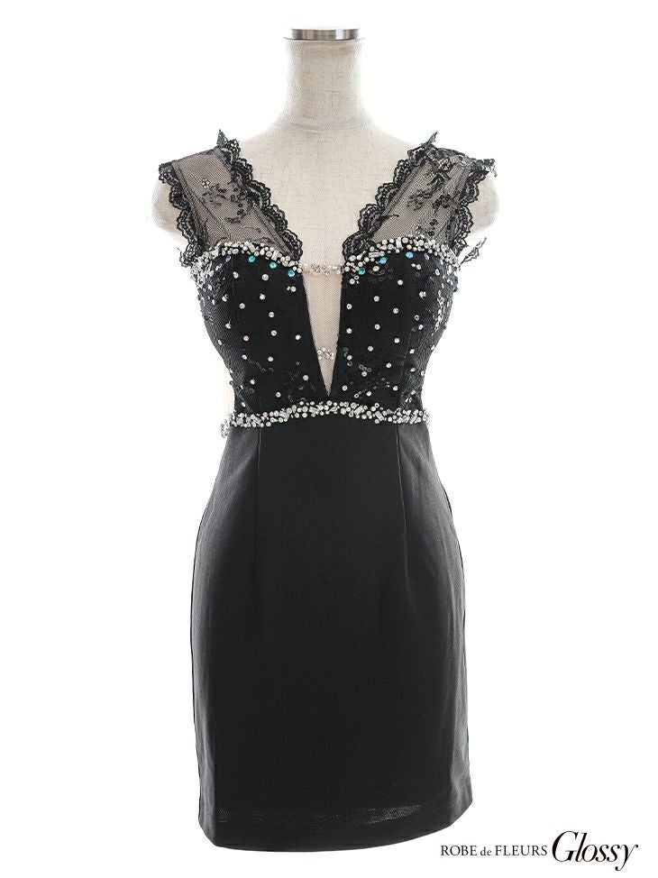 4. [ROBEdeFLEURSGlossy/ローブドフルールグロッシー] 高級プランジングネックバストビジューストレッチノースリーブタイトミニドレス