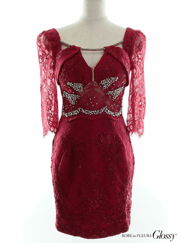 ROBEdeFLEURSGlossy ローブドフルールグロッシー 高級バストカットジップウエストシースルービジューレース袖ありタイトミニドレス