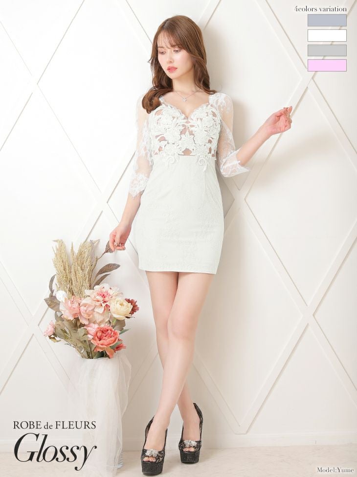 4. [ROBEdeFLEURSGlossy/ローブドフルールグロッシー] 高級フラワーモチーフレーススリーブハイウエスト切替ワンカラー袖ありタイトミニドレス