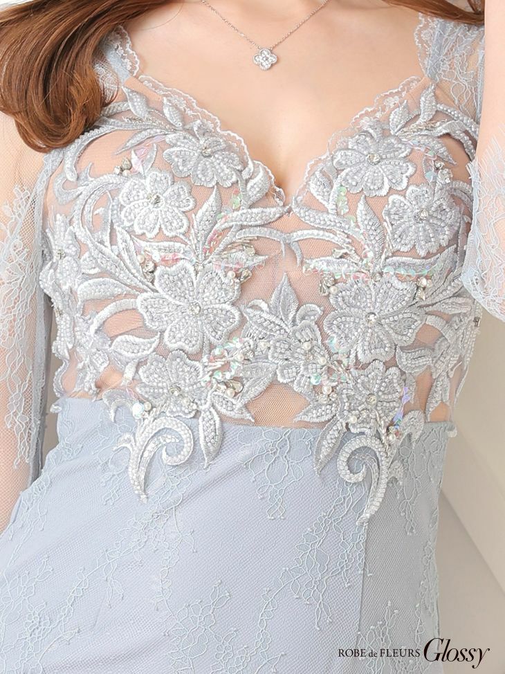 華やかなフラワーモチーフが上品☆ [ROBEdeFLEURSGlossy/ローブドフルールグロッシー] 高級フラワーモチーフレーススリーブハイウエスト切替ワンカラー袖ありタイトミニドレス