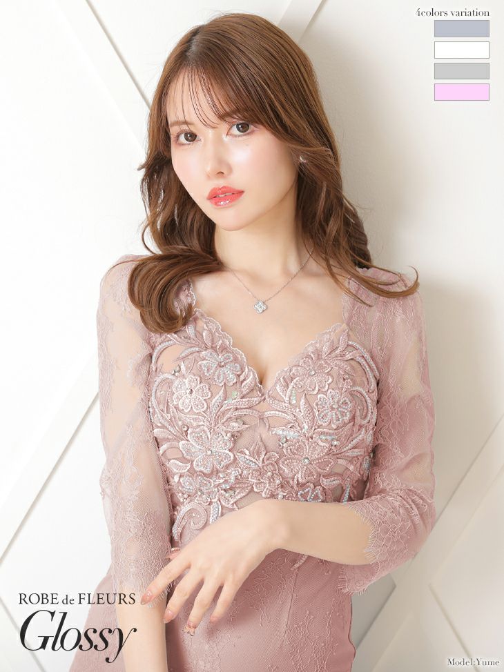 4. [ROBEdeFLEURSGlossy/ローブドフルールグロッシー] 高級フラワーモチーフレーススリーブハイウエスト切替ワンカラー袖ありタイトミニドレス