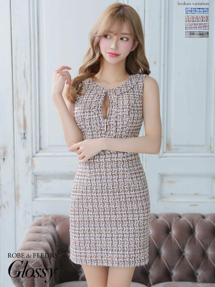 大人気ドレスがツイード素材になって再登場♡ [ROBEdeFLEURSGlossy/ローブドフルールグロッシー] 高級フロントジッパーツイードノースリーブタイトミニドレス