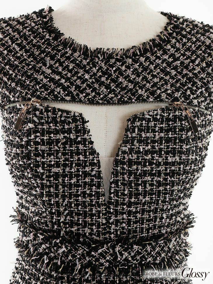 AWにピッタリ☆ [ROBEdeFLEURSGlossy/ローブドフルールグロッシー] 高級ノースリーブツイードフロントジップウエスト切り替えタイトミニドレス