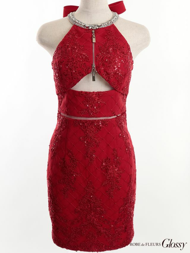 目を惹くバストデザインに視線釘付け☆ [ROBEdeFLEURSGlossy/ローブドフルールグロッシー] 高級 フロントジップ アンダーバストカット スパンコール 刺繍 谷間魅せ タイトミニドレス