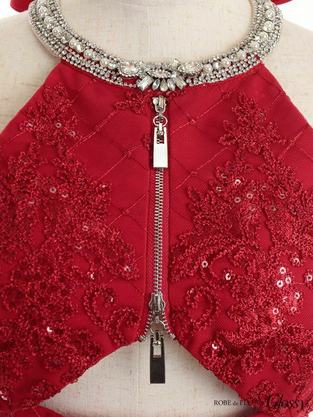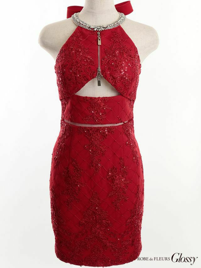 ホルターネックが特徴☆ [ROBEdeFLEURSGlossy/ローブドフルールグロッシー] 高級 フロントジップ アンダーバストカット スパンコール 刺繍 谷間魅せ タイトミニドレス