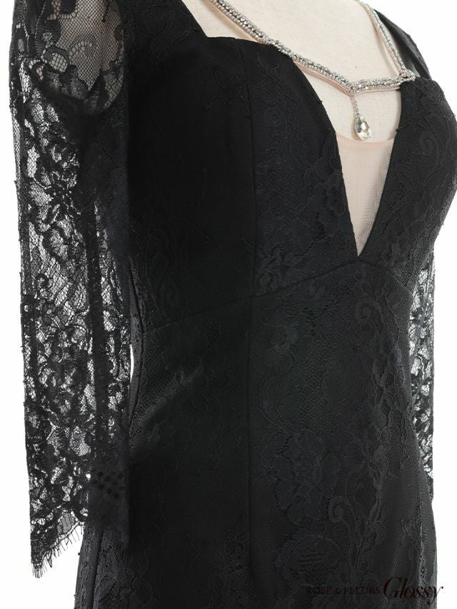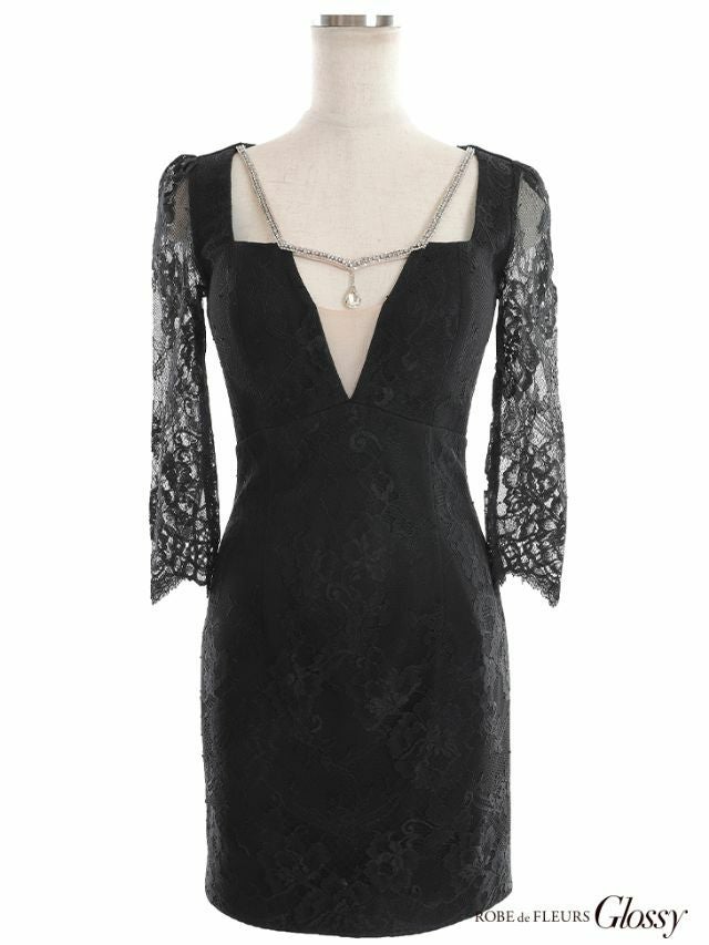 6. [ROBEdeFLEURSGlossy/ローブドフルールグロッシー] 高級 総レース バストシースルー ビジュー 袖あり 谷間魅せ タイトミニドレス