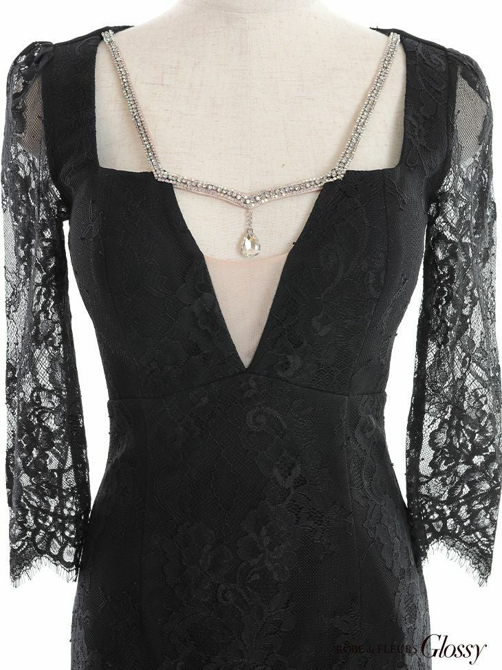 6. [ROBEdeFLEURSGlossy/ローブドフルールグロッシー] 高級 総レース バストシースルー ビジュー 袖あり 谷間魅せ タイトミニドレス