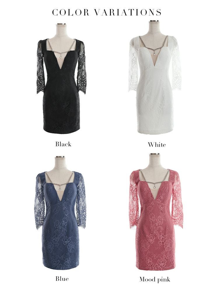 5. [ROBEdeFLEURSGlossy/ローブドフルールグロッシー] 高級 総レース バストシースルー ビジュー 袖あり 谷間魅せ タイトミニドレス