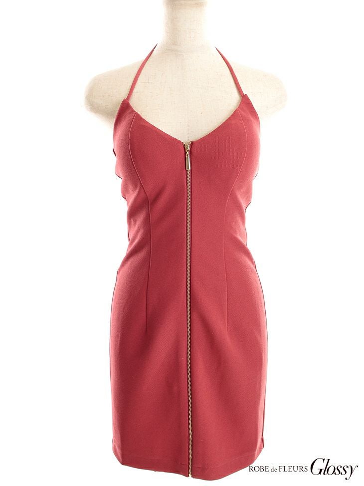 6. [ROBEdeFLEURSGlossy/ローブドフルールグロッシー] 高級ワンカラーフロントジップ2wayゴールドバックル袖ありタイトミニドレス