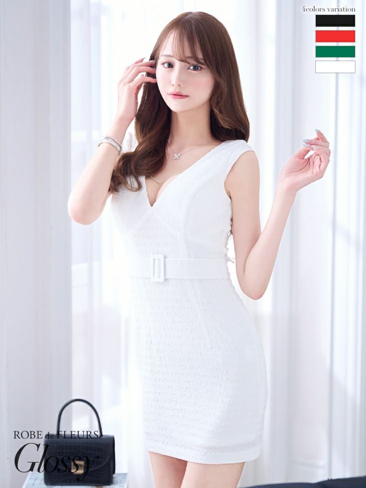 4. [ROBEdeFLEURSGlossy/ローブドフルールグロッシー] 高級ワンカラーバストチェーンウエストベルトデザインノースリーブタイトミニドレス