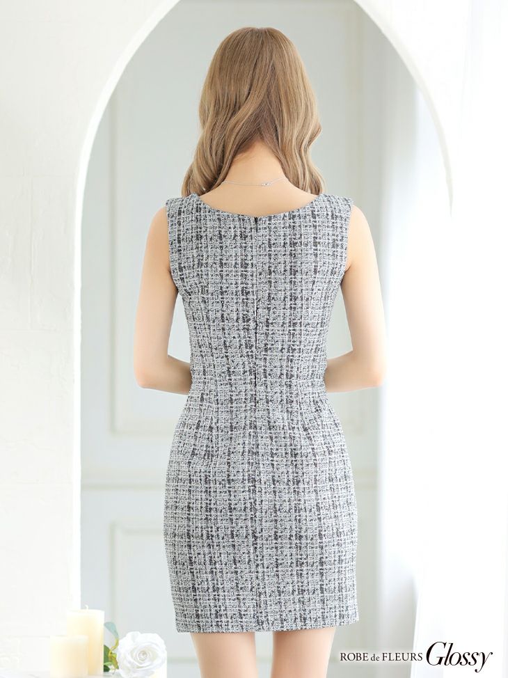 5. [ROBEdeFLEURSGlossy/ローブドフルールグロッシー] 高級チェック柄ノースリーブシンプルツイードウエストマークタイトミニワンピースドレス