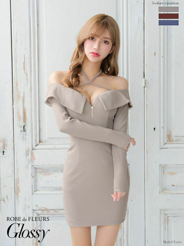 4. [ROBEdeFLEURSGlossy/ローブドフルールグロッシー] 高級クロスジップオフショルダーニット長袖 袖ありタイトミニドレス