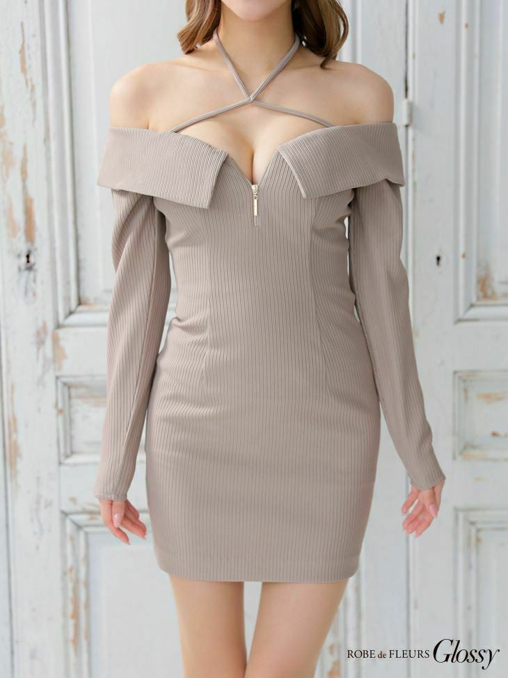 程よくカジュアルでこなれた印象に☆ [ROBEdeFLEURSGlossy/ローブドフルールグロッシー] 高級クロスジップオフショルダーニット長袖 袖ありタイトミニドレス