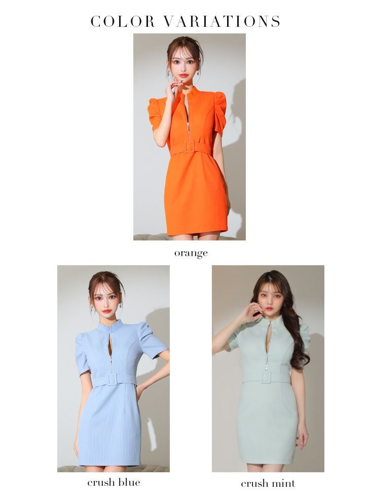ジッパーの開け方次第でセクシーにも☆ [ROBEdeFLEURSGlossy/ローブドフルールグロッシー] 高級バストフロントジップパフスリーブツイードウエストベルト半袖タイトミニドレス