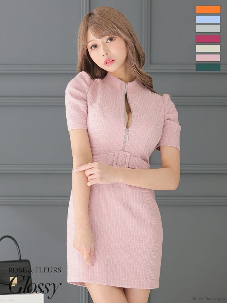 キャバドレス ミニドレス [ROBEdeFLEURSGlossy/ローブドフルールグロッシー] 高級バストフロントジップパフスリーブツイードウエストベルト半袖タイトミニドレス
