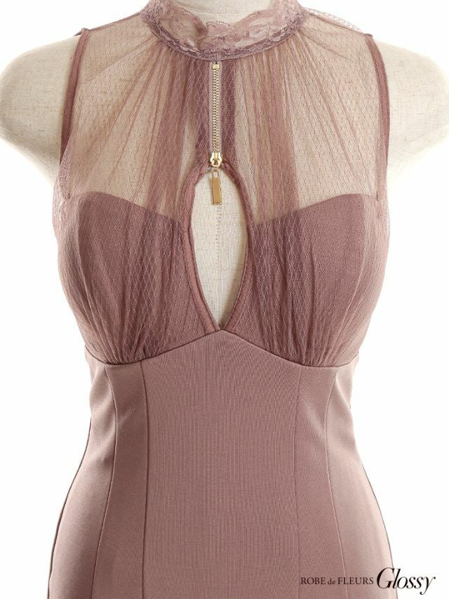 ROBEdeFLEURSGlossy ローブドフルールグロッシー 高級フリルスタンドネックバストジップカットアウトワンカラーノースリーブタイトミニドレス