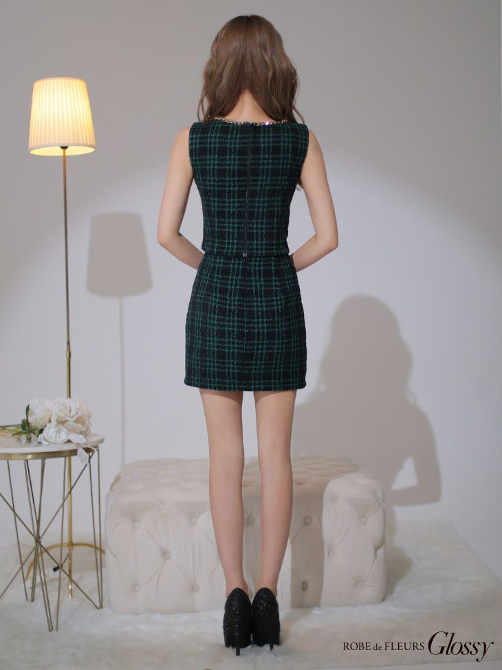 5. [ROBEdeFLEURSGlossy/ローブドフルールグロッシー] 高級ホリデーチェック柄ツイードノースリーブセットアップタイトミニドレス