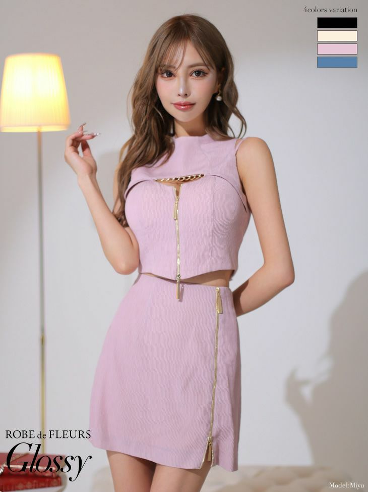 ファスナーでセクシーに着れる☆ [ROBEdeFLEURSGlossy/ローブドフルールグロッシー] 高級マルチファスナーハイネックノースリーブセットアップタイトミニドレス