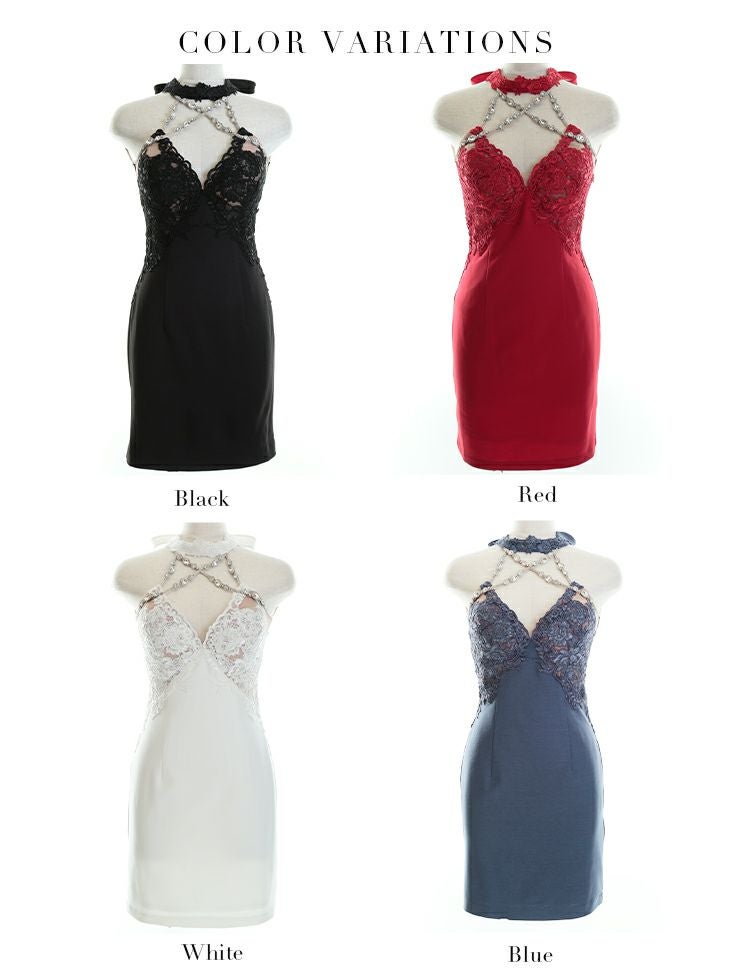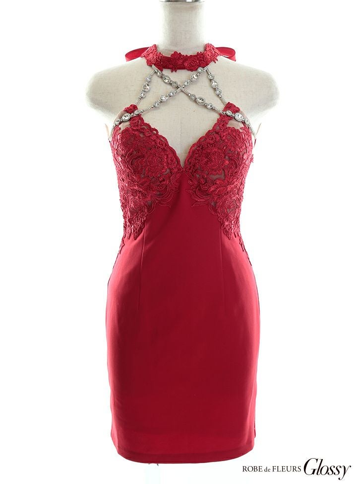 バストを強調させた大胆なデザイン☆ [ROBEdeFLEURSGlossy/ローブドフルールグロッシー] 高級チョーカー風バストクロスホルターネックビジューデザインタイトミニドレス