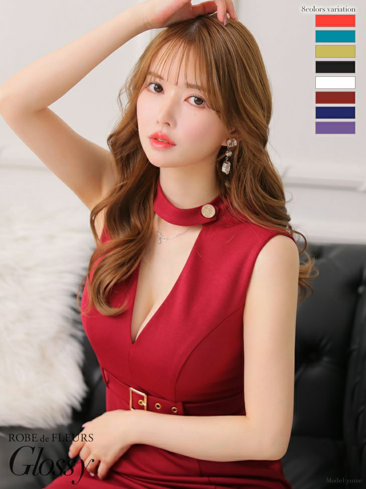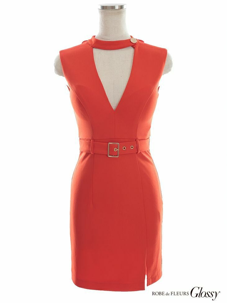 大胆なVカットがセクシー☆ [ROBEdeFLEURSGlossy/ローブドフルールグロッシー] 高級チョーカー風バックカットアウトベルトデザインノースリーブタイトミニドレス