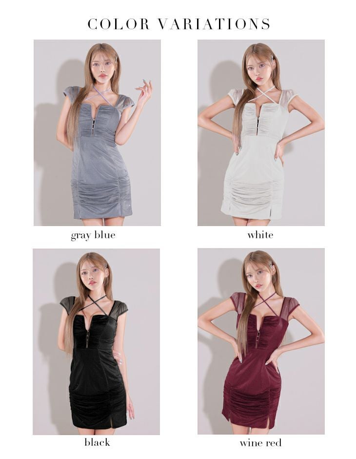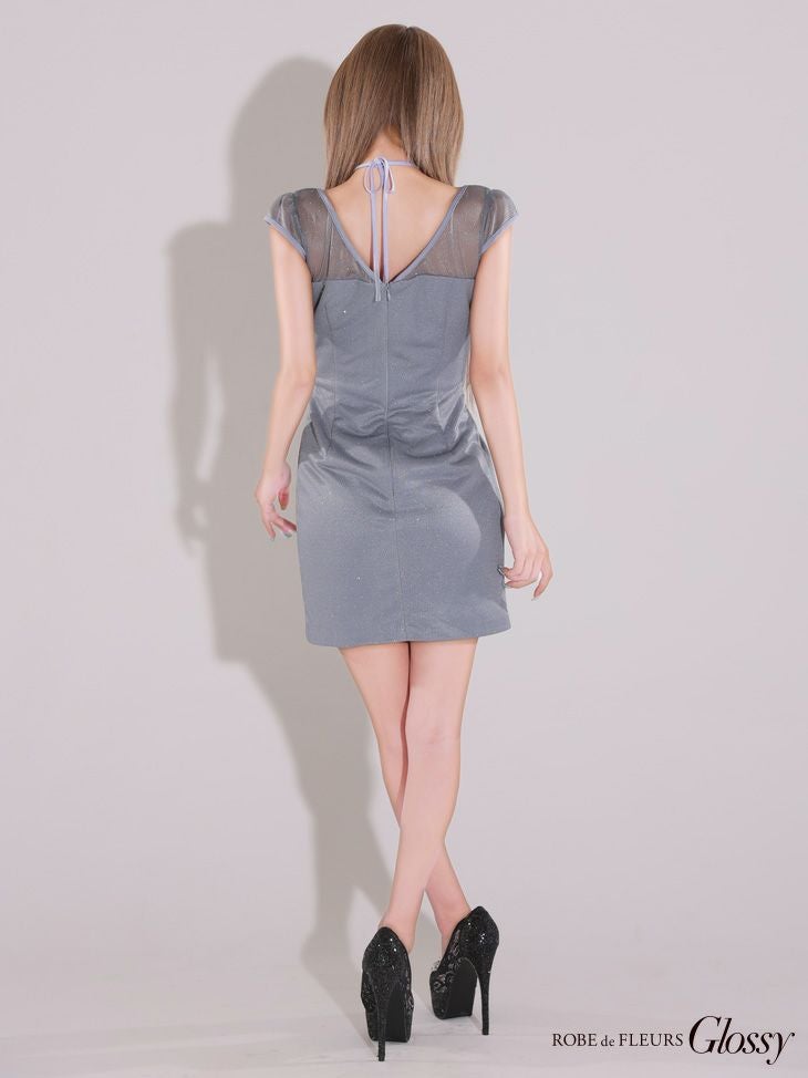 4. [ROBEdeFLEURSGlossy/ローブドフルールグロッシー] 高級 ホルターネック フロントジップ パイピング ラメニット バストカット 谷間魅せ タイトミニドレス