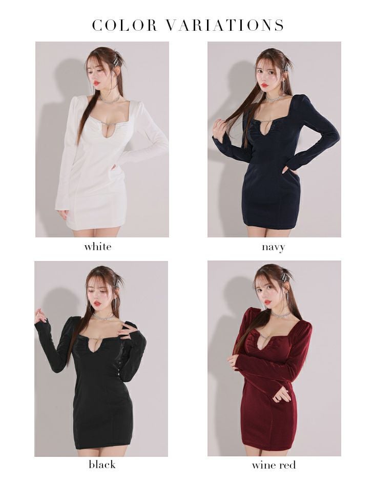 ワンカラーで高級感溢れる☆ [ROBEdeFLEURSGlossy/ローブドフルールグロッシー] 高級 長袖 袖あり バックリボン スクエアカット バストカット シルバーチェーン 谷間魅せ タイトミニドレス
