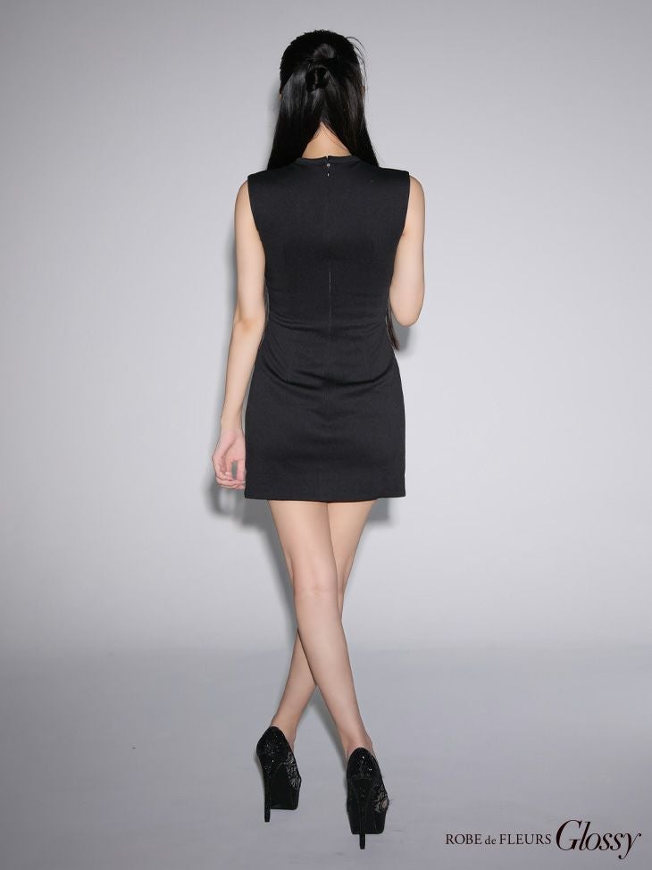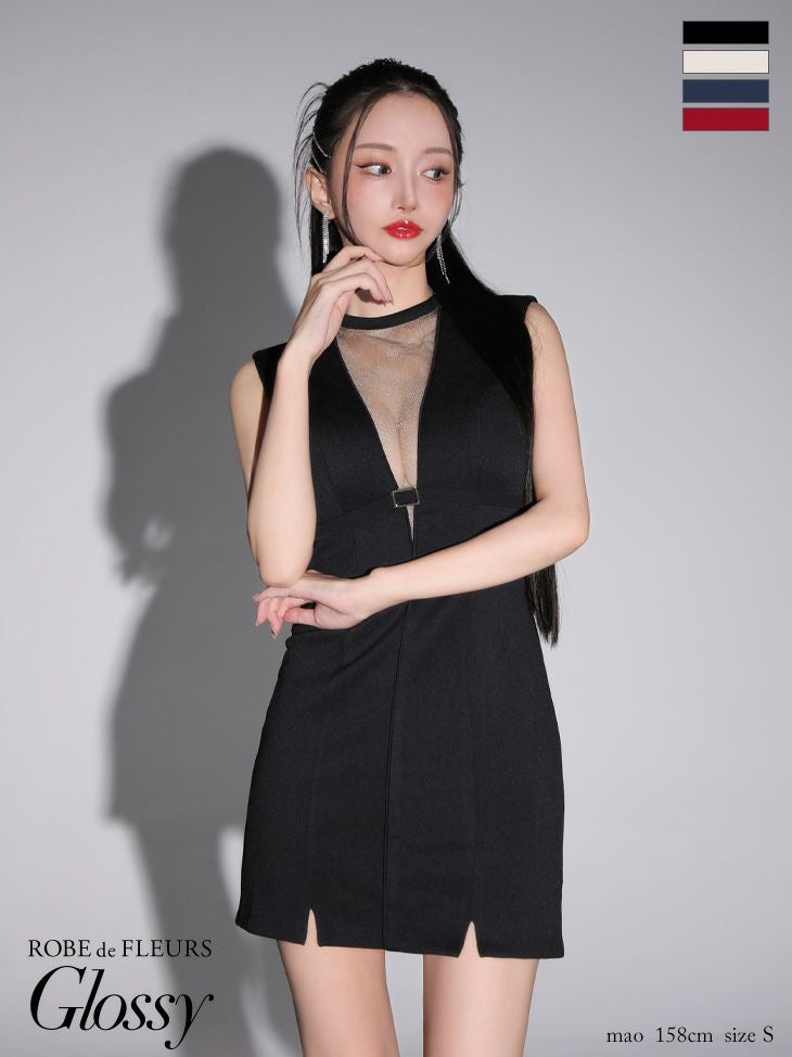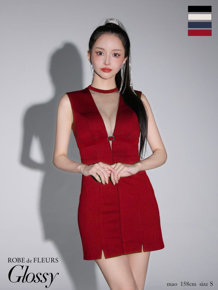 [ROBEdeFLEURSGlossy/ローブドフルールグロッシー] 高級 ワンカラー ベルトデザイン デコルテバストシースルー ノースリーブ 谷間魅せ タイトミニドレス