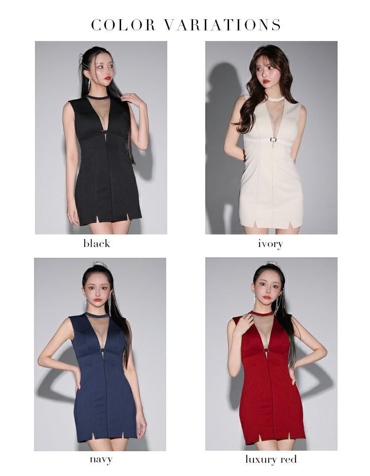 4. [ROBEdeFLEURSGlossy/ローブドフルールグロッシー] 高級 ワンカラー ベルトデザイン デコルテバストシースルー ノースリーブ 谷間魅せ タイトミニドレス