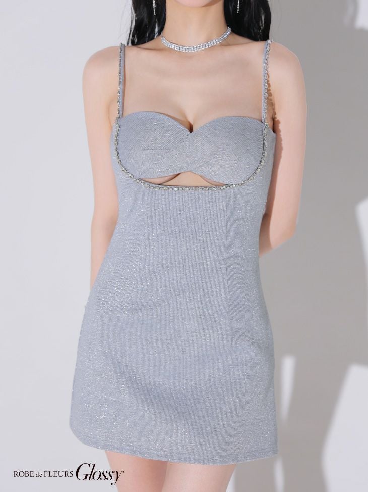 ラメがキラキラ輝く☆ [ROBEdeFLEURSGlossy/ローブドフルールグロッシー] 高級ビジュー縁取りバストツイストラメキャミソールタイトミニドレス