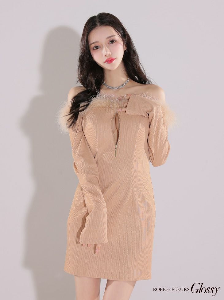 4. [ROBEdeFLEURSGlossy/ローブドフルールグロッシー] 高級 ファー付き 長袖 袖あり リブニット バストカット ジップ オフショルダー 谷間魅せ タイトミニドレス