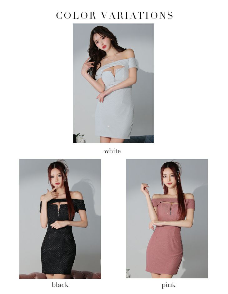 6. [ROBEdeFLEURSGlossy/ローブドフルールグロッシー] 高級 ジップ バストカット ワンカラー ストレッチ オフショルダー 谷間魅せ タイトミニドレス