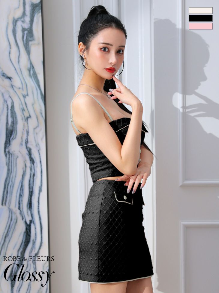 キャバドレス ミニドレス ROBEdeFLEURSGlossy/ローブドフルールグロッシー 高級キャミソールラメニットセットアップ襟デザインポケットボタンデザインバイカラータイトミニドレス