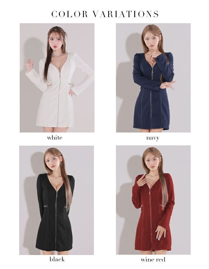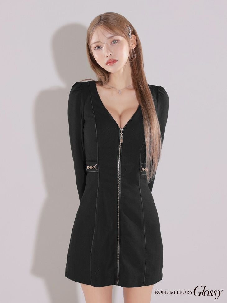 6. [ROBEdeFLEURSGlossy/ローブドフルールグロッシー] 高級長袖 袖ありフロントジップウエストゴールドチャームタイトミニドレス